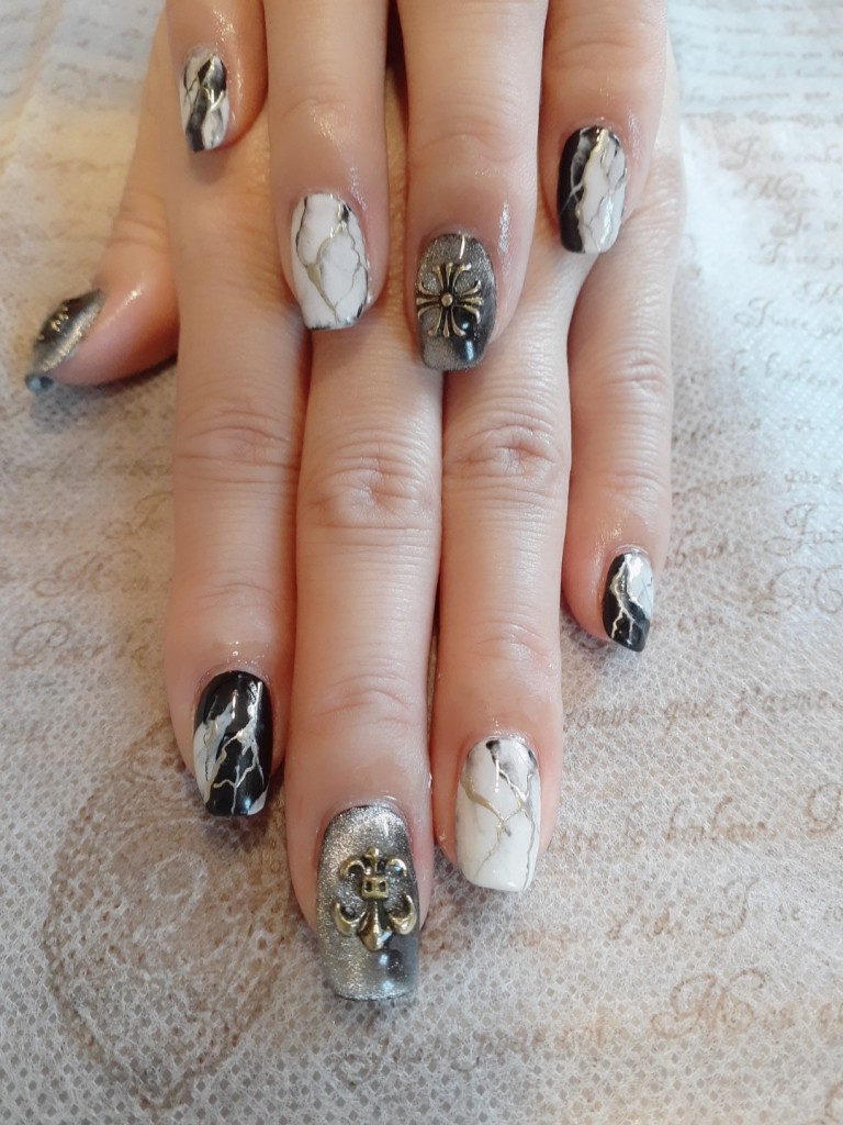 ホワイト ブラックの大理石ネイルに